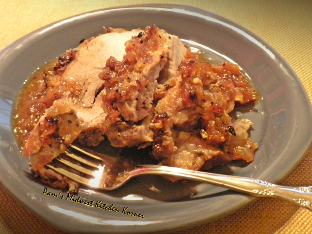 Dinner last night ~ no electricity, no cooking ~ so it was fast food. We had this savory roasted pork loin Monday evening. The recipe was in our local newspaper, The Northwest Herald a while back and it is outstanding to say the least! The onions and citrus juices were the perfect combination and I have a feeling I will be making this again soon! Wonder if I should go back to cooking with gas…