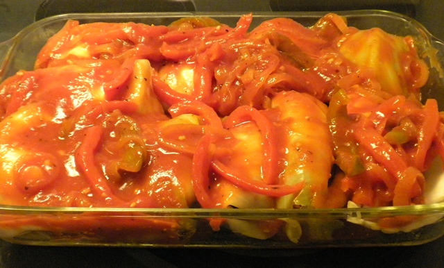 - Now gently ladle the spicy tomato sauce over the cabbage rolls, and cover tightly with a piece of aluminum foil. Poke three small air holes down the center of the foil and bake for 1½ hours until cooked.